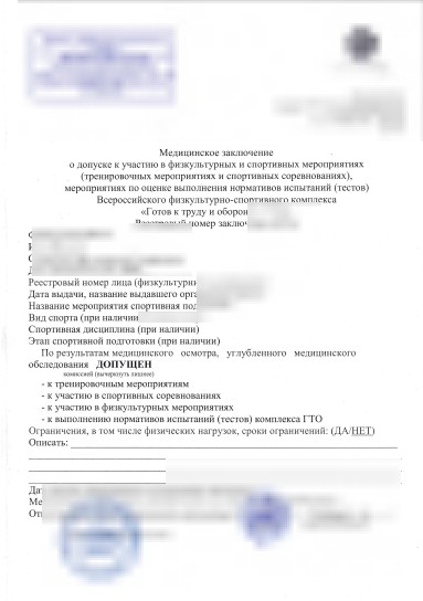 - Заключение с формулировкой следующего содержания: «Допущен к соревнованиям по циклическим видам спорта» (допущен к бегу с препятствиями на дистанции до 10 км включительно).