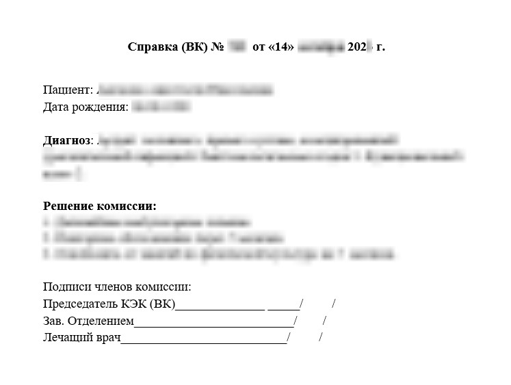Справка, выданная КЭК, дает возможность пациенту лечиться на протяжении года без присвоения ему группы инвалидности. При этом за больным сохраняются место работы, его не могут отчислить из учебного заведения.
