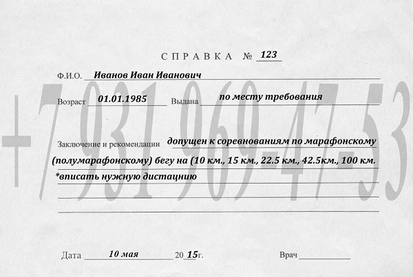 В медсправке с подтверждением отсутствия патологий, при которых марафон противопоказан, по требованию учредителей могут быть внесены и дополнительные сведения – данные ЭКГ, выписка из личной медицинской карты. Сам документ можно получить сразу в день обращения. Звоните, и мы расскажем, где и как купить справку недорого.