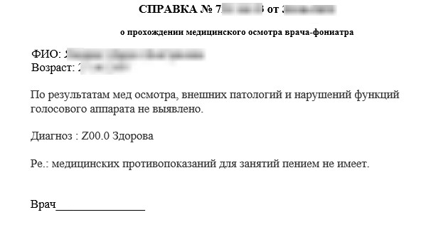 Перед поступлением в музыкальное училище или институт абитуриенту нужно взять справку от врача-фониатра. Она выдается с заключением «здоров», если при обследовании не выявлены заболевания, являющиеся противопоказанием для занятий вокалом и музыкой. В Санкт-Петербурге получить такую справку можно с помощью специалистов нашего центра.
