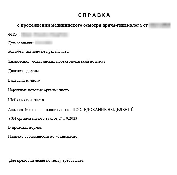 Гинекологический осмотр можно пройти в муниципальной женской поликлинике или в частном медцентре. На прием нужно прийти с паспортом и с амбулаторной картой при ее наличии. Врач сначала проводит стандартный опрос и выясняет жалобы, затем проводит осмотр на гинекологическом кресле с взятием мазков. На первичном приеме ставит первоначальный диагноз, а после получения результатов анализов окончательный. Таким образом, справку от гинеколога получится взять только при повторном посещении специалиста.